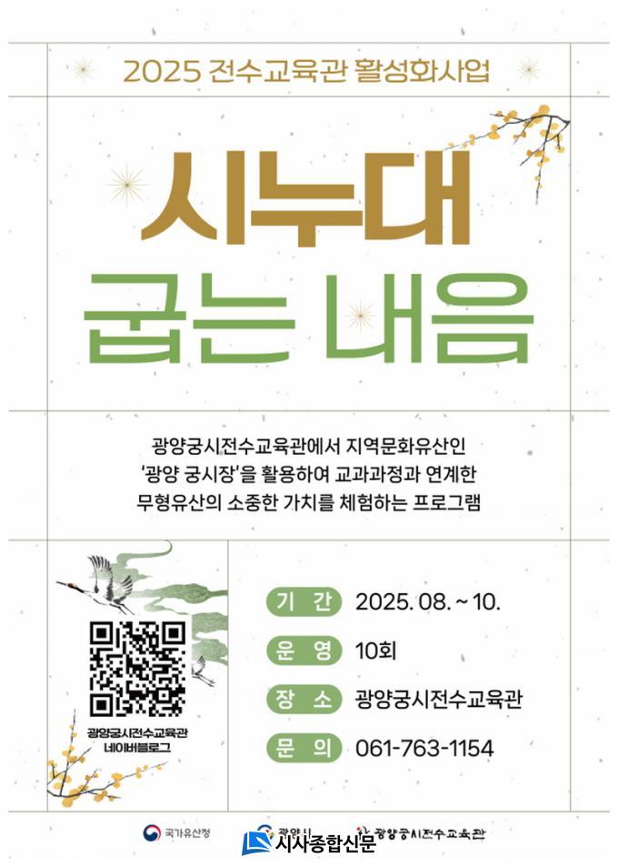 ÀÌ ÇÁ·Î±×·¥Àº ±¹°¡À¯»êûÀÌ ÁÖÃÖÇÏ°í ±¤¾ç±Ã½ÃÀü¼ö±³À°°üÀÌ ÁÖ°üÇÏ´Â ¡®2025 Àü¼ö±³À°°ü Ȱ¼ºÈ »ç¾÷¡¯ÀÇ ÀÏȯÀ¸·Î ÃßÁøµÈ´Ù. º» »ç¾÷Àº ¹«Çü¹®ÈÀ¯»ê Àü¼ö±³À°°üÀ» Áö¿ª ¹®ÈÀÇ Á᫐ °ÅÁ¡À¸·Î À°¼ºÇϰí, ÀüÅë¹®ÈÀÇ Àü½Â ±â¹ÝÀ» °ÈÇϱâ À§ÇÑ °ø¸ð»ç¾÷ÀÌ´Ù.
