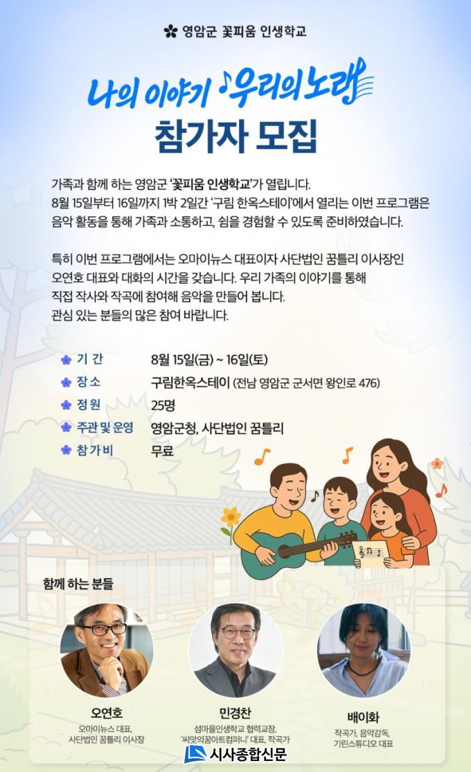 ƯÈ÷, ÀüÅë ÇÑ¿Á ¼÷¹Ú½Ã¼³ÀÎ ±¸¸²ÇÑ¿Á½ºÅ×ÀÌ¿¡¼ °¡Á·°ú À½¾ÇÀ» ¸¸µé¸ç ¸Â´Â ÇÏ·í¹ãÀº ÀØÁö ¸øÇÒ ¿©¸§¹ãÀÇ Ãß¾ïÀ» ¼±»çÇÒ ¿¹Á¤ÀÌ´Ù. Âü°¡ºñ ¹«·áÀÎ ÀλýÇб³¿¡´Â ÃÊ・ÁßÇлý Àڳฦ µÐ °¡Á·ÀÌ ½ÅûÇÒ ¼ö ÀÖ°í, ±³À° ½Åû°ú ¾È³»´Â ¿µ¾Ï±º ÀÎÀçÀ°¼ºÃ¼À°°ú Àι®µµ½ÃÆÀ(061-470-2257)¿¡¼ ÇÑ´Ù.