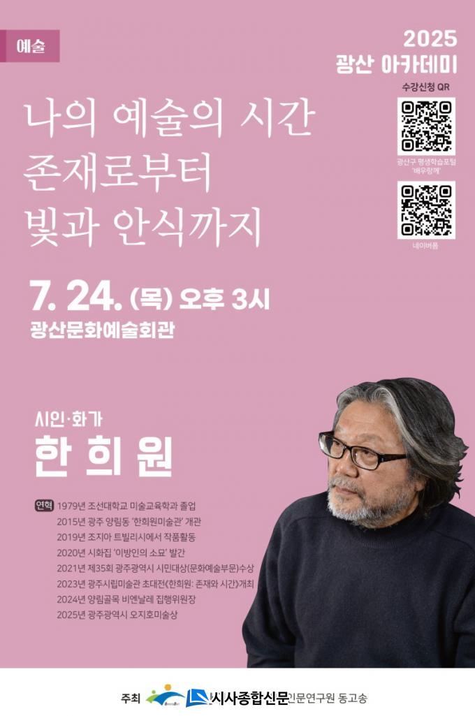 ±¤ÁÖ Ãâ½ÅÀÇ ÇÑÈñ¿ø ÀÛ°¡´Â ÀÚ¿¬°ú Àΰ£, ½Ã°£°ú Á¸Àç¿¡ ´ëÇÑ ½ÃÀûÀ̰í öÇÐÀûÀÎ »çÀ¯¸¦ È¸È¿Í ¼³Ä¡ ÀÛ¾÷À¸·Î Ç®¾î³»¸ç, Áö¿ªÀÇ Á¤Ã¼¼º°ú ¿¹¼úÀû °¨¼ö¼ºÀ» ²ÙÁØÈ÷ Ç¥ÇöÇØ ¿Ô´Ù.