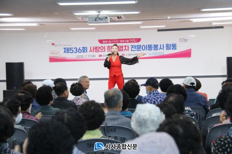 [½Ã»çÁ¾ÇսŹ® = ¿À½ÂÅà ±âÀÚ] »ç´Ü¹ýÀÎ ÀüÁÖ½ÃÀÚ¿øºÀ»ç¼¾ÅÍ(ÀÌ»çÀå ÃÖÀÌõ)¿Í ÀÎÈÄ1µ¿Áֹμ¾ÅÍ(µ¿Àå Àӹ̿µ)´Â 17ÀÏ ¾È°ñ³ëÀκ¹Áö°ü(°üÀå ¹Ú¼öÁø)¿¡¼ ³ëÀÎ 400¿© ¸íÀ» ´ë»óÀ¸·Î µû¶æÇÑ Á¡½É ½Ä»ç¿Í °Ç° µ¹º½ ¼ºñ½º, ¹®È °ø¿¬À» Á¦°øÇÏ´Â ¡®»ç¶ûÀÇ Èñ¸Á¿Â÷ Àü¹®À̵¿ºÀ»ç¡¯ Ȱµ¿À» Àü°³Çß´Ù.