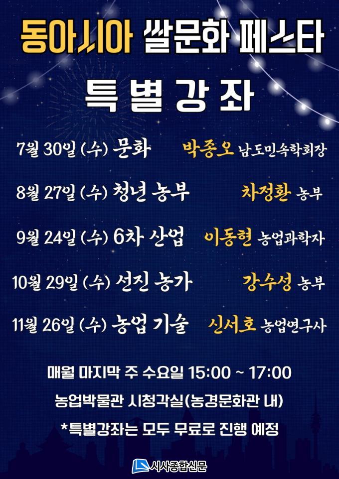 ÃÑ 5ȸ¿¡ °ÉÃÄ ÁøÇàµÇ´Â À̹ø °Á´ ¹®È, û³â³ó¾÷, 6Â÷»ê¾÷, ¼±Áø³ó°¡, ³ó¾÷±â¼ú µî ´Ù¾çÇÑ ºÐ¾ßÀÇ Àü¹®°¡¿Í ½Çõ°¡°¡ Âü¿©ÇØ ½ÒÀ» µÑ·¯½Ñ »î°ú ¹®È, »ê¾÷ÀÇ º¯È¿Í Áö¼Ó °¡´É¼ºÀ» °íÂûÇÏ´Â ½Ã°£À¸·Î ²Ù¸çÁø´Ù.