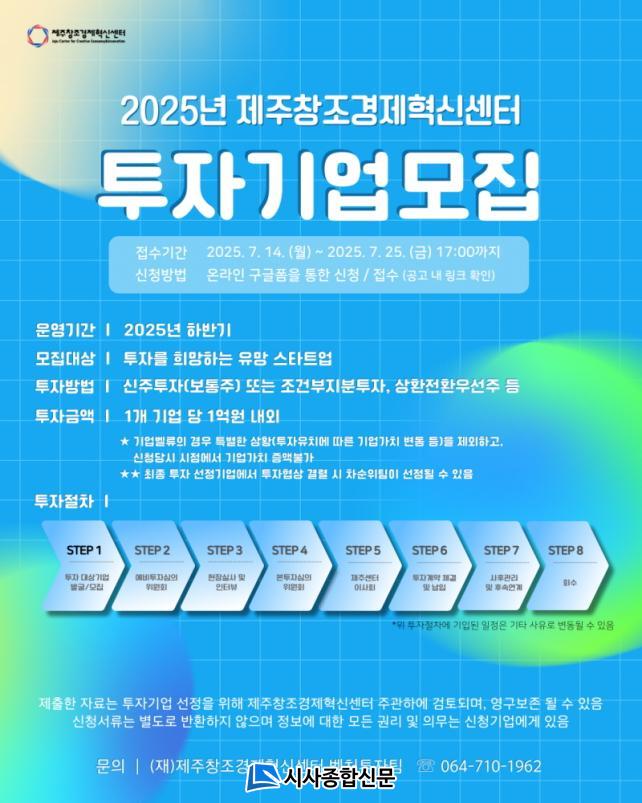 ½ÅûÀº ¿À´Â 25ÀÏ(±Ý) ¿ÀÈÄ 5½Ã±îÁö Á¦ÁÖâÁ¶°æÁ¦Çõ½Å¼¾ÅÍ È¨ÆäÀÌÁö¿¡¼ °¡´ÉÇϸç, ÃÖÁ¾ ÅõÀÚ°è¾àÀº 9¿ù Áß ¸¶¹«¸®µÈ´Ù. ÇϹݱ⠳»¿¡ ÀÚ±ÝÁ¶´ÞÀÌ ÇÊ¿äÇÑ ±â¾÷À̶ó¸é ´«¿©°Üº¼ ¸¸ÇÏ´Ù.