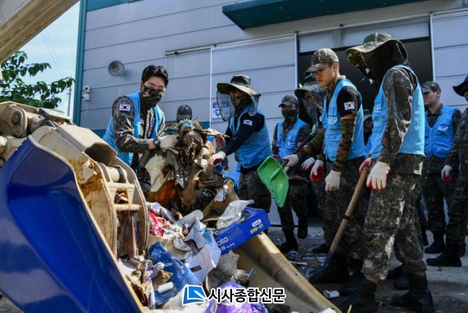 ¹«´õ¿î ³¯¾¾¿´Áö¸¸, µÎ ÆÈÀ» °È¾îºÙÀÎ À庴µéÀÇ ÀÇÁö´Â ¶ß°Å¿ü´Ù. ¹°ÀÌ µé¾îÂù ¸¶´ç¿¡ ½×ÀÎ ¾²·¹±â¸¦ ¼Õ¼ö Ä¡¿ü°í, ħ¼öµÈ Æó°¡ÀüÀº ¾ÈÀü¿¡ À¯ÀÇÇØ ÁßÀåºñ¸¦ µ¿¿øÇÏ¿© ó¸®Çß´Ù. Áý¾È±îÁö ¹Ð·Áµç ¹°Àº ¹è¼öÆßÇÁ¸¦ Ȱ¿ëÇØ ½Å¼ÓÈ÷ ¹èÃâÇÔÀ¸·Î½á ¿ø·¡ ¸ð½ÀÀ» µÇãµµ·Ï µµ¿Ô´Ù. Áö¿ª¹ÎÀÇ °¨»ç Àλ縦 µè´Â À庴µéÀÇ ¾ó±¼¿£ ¾î´À»õ ȯÇÑ ¿ôÀ½²ÉÀÌ ÇǾú´Ù.