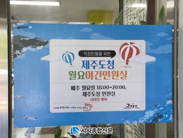 Á¦ÁÖµµ´Â ÆòÀÏ ÁÖ°£ ¹æ¹®ÀÌ ¾î·Á¿î Á÷ÀåÀΰú Çлý µîÀÇ ÇàÁ¤¼ºñ½º Á¢±Ù¼ºÀ» ³ôÀ̱â À§ÇØ ¸ÅÁÖ ¿ù¿äÀÏ(°øÈÞÀÏ Á¦¿Ü) ¿ÀÈÄ 6½ÃºÎÅÍ 8½Ã±îÁö ¡®Á¦ÁÖµµÃ» ¿ù¿ä¾ß°£¹Î¿ø½Ç¡¯À» ¿î¿µÇϰí ÀÖ´Ù.