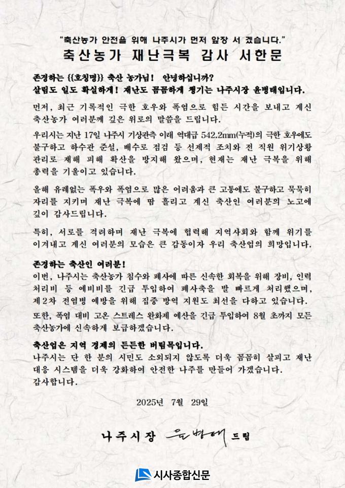 ½Ã´Â Áö³ 29ÀÏ ±â·ÏÀûÀΠȣ¿ì¿Í ¿¬ÀÏ À̾îÁö´Â Æø¿° ¼Ó¿¡¼µµ Àç³ ±Øº¹À» À§ÇØ ÇöÀå¿¡¼ ºÐÅõÇϰí ÀÖ´Â Ãà»ê³ó°¡¿¡ À±º´Å ½ÃÀå ¸íÀÇÀÇ °¨»ç ¼Çѹ®À» Àü´ÞÇß´Ù°í ¹àÇû´Ù.