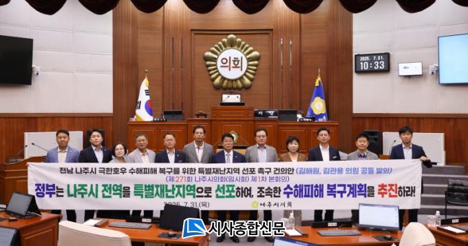 [½Ã»çÁ¾ÇսŹ® = ¿À½ÂÅà ±âÀÚ] ³ªÁÖ½ÃÀÇȸ(ÀÇÀå ÀÌÀç³²)´Â 31ÀÏ Á¦271ȸ ÀÓ½Ãȸ Á¦1Â÷ º»È¸ÀǸ¦ ¿°í ÃÖ±Ù ¹ß»ýÇÑ ±â·ÏÀûÀÎ ±ØÇÑÈ£¿ì·Î ÀÎÇÑ ³ªÁֽà Àü¿ª¿¡ ¸·´ëÇÑ Àç»ê¡¤»ý°è ÇÇÇØ°¡ ¹ß»ýÇÑ µ¥ ´ëÇØ, Á¤ºÎ¿¡ ¡®Æ¯º°Àç³Áö¿ª¡¯ ¼±Æ÷¸¦ °·ÂÈ÷ Ã˱¸ÇÏ´Â °ÇÀÇ¾È Ã¤ÅÃÇß´Ù.