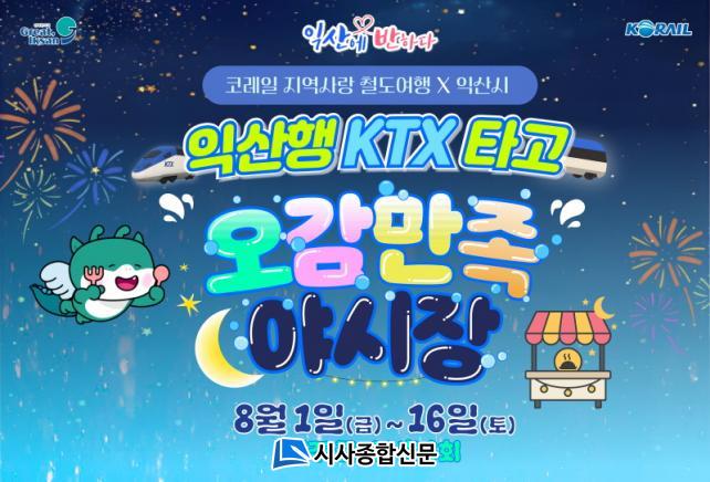 ¿À°¨¸¸Á· ¾ß½ÃÀåÀº Àͻ꿪 Àα٠Áß¾Ó½ÃÀå¿¡¼ ¿¸®´Â Çà»ç·Î, ´Ù¾çÇÑ ¸Ô°Å¸®¿Í °ø¿¬, üÇèÀ» Áñ±æ ¼ö ÀÖ´Ù. »óǰÀº KTX ¿Õº¹ ¿Â÷±Ç°ú ¾ß½ÃÀå ÀÌ¿ë±Ç(1¸¸ ¿ø±Ç), Åä¿äÀϰú °øÈÞÀÏ¿¡´Â ÀÍ»ê ½ÃÆ¼Åõ¾î¹ö½º 1ÀÏ ÀÌ¿ë±Ç±îÁö Æ÷ÇԵоËÂù ¿©ÇàÀ» Áñ±æ ¼ö ÀÖ´Ù.