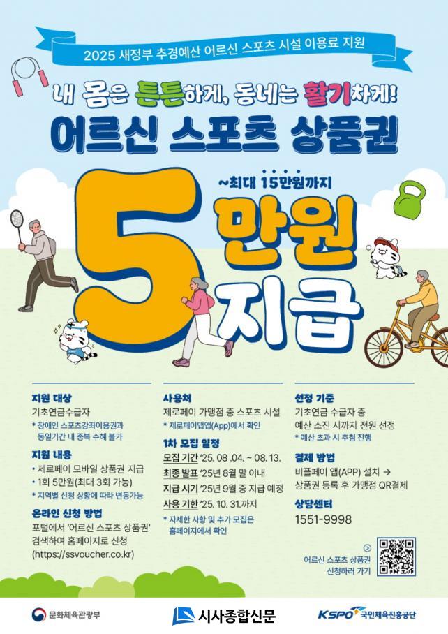 ¾î¸£½Å ½ºÆ÷Ã÷½Ã¼³ ÀÌ¿ë·á Áö¿ø»ç¾÷Àº ±âÃÊ¿¬±ÝÀ» ¹Þ´Â ¸¸65¼¼ ÀÌ»ó(1960³â ÀÌÀü Ãâ»ýÀÚ) ¾î¸£½Å ´©±¸³ª ½Åû°¡´ÉÇÏ¸ç ½Åû±â°£Àº 8¿ù 4ÀϺÎÅÍ 13ÀϱîÁö·Î ¾î¸£½Å ½ºÆ÷Ã÷»óǰ±Ç ´©¸®Áý(ssvoucher.or.kr)¿¡¼ ½ÅûÇÏ¸é µÈ´Ù.
