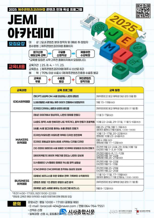 ¡®JEMI ¾ÆÄ«µ¥¹Ì¡¯´Â Á¦ÁÖÄÜÅÙÃ÷ÄÚ¸®¾Æ·¦ ±â¹ÝÀÇ ´ëÇ¥ ±³À° ÇÁ·Î±×·¥À¸·Î, ÄÜÅÙÃ÷ ºÐ¾ß âÀÛÀÚ ¹× ¿¹ºñ â¾÷¡¤Ãë¾÷ÀÚ¸¦ ´ë»óÀ¸·Î ±âȹ, Á¦ÀÛ, »ç¾÷È µî ´Ü°èº° ½Ç¹« Á᫐ ±³À°À» Á¦°øÇÏ¿© Áö¿ª ÄÜÅÙÃ÷ »ýŰè Ȱ¼ºÈ¸¦ µµ¸ðÇϰí ÀÖ´Ù.