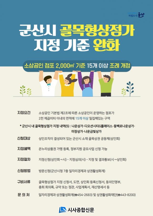 ½Ã´Â ÃÖ±Ù ¡®±º»ê½Ã °ñ¸ñÇü»óÁ¡°¡ ÁöÁ¤¿¡ °üÇÑ Á¶·Ê¡¯ °³Á¤À» ÅëÇØ ÁöÁ¤ ±âÁØÀ» ±âÁ¸ 2,000§³ À̳» ¸éÀû¿¡ ¼Ò»ó°øÀÎÀÌ ¿î¿µÇÏ´Â Á¡Æ÷ »ó¾÷Áö¿ª 25°³ ÀÌ»ó, ºñ»ó¾÷Áö¿ª 20°³ ÀÌ»ó ¹ÐÁý¿¡¼ 15°³ ÀÌ»óÀ¸·Î ¹ÐÁý ±âÁØÀ» ¿ÏÈÇß´Ù.