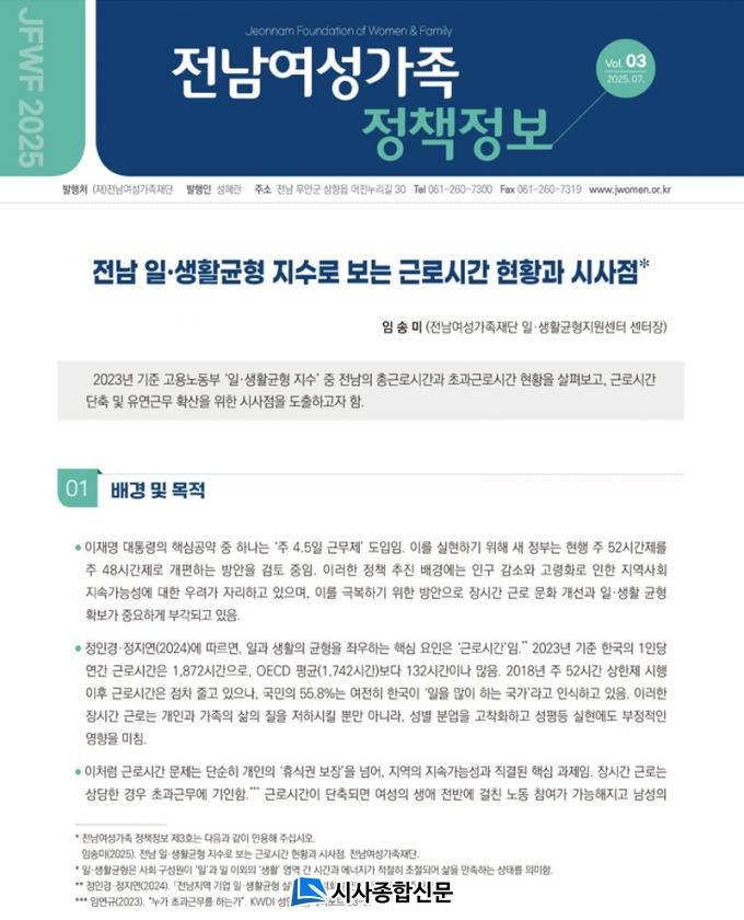 Àü³²¿©¼º°¡Á·Àç´Ü ¼ºÇý¶õ ¿øÀåÀº ¡°±Ù·Î½Ã°£ ´ÜÃà°ú ÀÏ¡¤»ýȰ±ÕÇüÀº ±ä¹ÐÈ÷ ¿¬°áµÇ¾î ÀÖ´Ù¡±¸ç, ¡°Àü³²¿©¼º°¡Á·Àç´ÜÀº À¯¿¬ÇÑ ±Ù¹«È¯°æ Á¶¼º°ú ÃæºÐÇÑ ÈÞ°¡ º¸Àå µî ±Ù·Îȯ°æ Àü¹Ý¿¡ ´ëÇÑ Ã¼°èÀûÀÎ Á¡°Ë°ú ¼ºÀÎÁöÀû Á¤Ã¥ ÀüȯÀ» ÅëÇØ µµ¹ÎÀÇ »îÀÇ Áú Çâ»ó¿¡ ¾ÕÀå¼°Ú´Ù¡±°í ¹àÇû´Ù.
