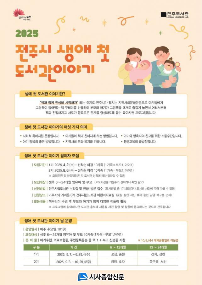 ÀüÁֽà °¢ µµ¼°ü¿¡¼ »ýÈÄ 6°³¿ùºÎÅÍ 24°³¿ù »çÀÌÀÇ ¿µ¡¤À¯¾Æ ¹× ºÎ¸ð 10°¡Á·(ÆòÀÏ), »ýÈÄ 25°³¿ùºÎÅÍ 48°³¿ù »çÀÌÀÇ ¿µ¡¤À¯¾Æ 15°¡Á·(ÁÖ¸»)À» °¢°¢ ¸ðÁýÇØ Ã¥ ³îÀÌ¿Í Ã¥ ÀоîÁÖ±â Ȱµ¿À» ¿î¿µÇÒ ¿¹Á¤ÀÌ´Ù.