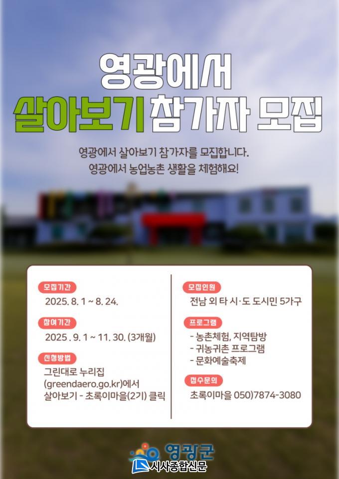 [½Ã»çÁ¾ÇսŹ® = ¿À½ÂÅà ±âÀÚ] ¿µ±¤±º(±º¼ö Àå¼¼ÀÏ)Àº ±Í³ó¡¤±ÍÃÌÀ» Èñ¸ÁÇÏ´Â µµ½Ã¹ÎÀÇ ¾ÈÁ¤ÀûÀÎ ³óÃÌ Á¤ÂøÀ» Áö¿øÇϱâ À§ÇØ ¡¸2025³â ¿µ±¤¿¡¼ »ì¾Æº¸±â¡¹ 2±â Âü°¡ÀÚ¸¦ ¸ðÁýÇÑ´Ù.