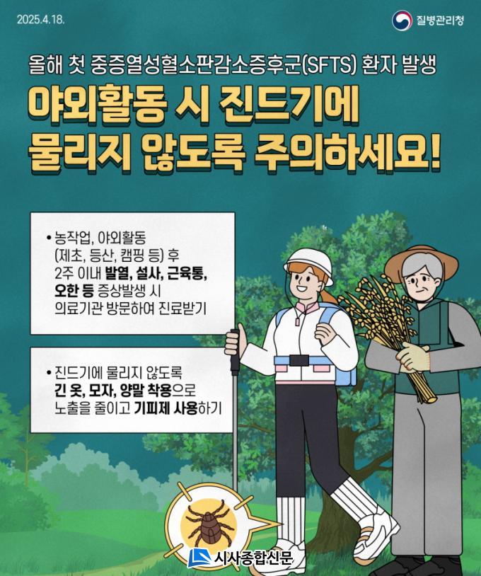 Áøµå±â ¸Å°³ °¨¿°º´¿¡´Â ÁßÁõ¿¼ºÇ÷¼ÒÆÇ°¨¼ÒÁõÈıº(SFTS)°ú ÂêÂê°¡¹«½ÃÁõÀÌ ÀÖÀ¸¸ç, ³óÀÛ¾÷, µî»ê, Ä·ÇÎ, ¹úÃÊ µî ¾ß¿ÜȰµ¿ÀÌ ¸¹¾ÆÁö¸é¼ °¨¿° À§ÇèÀÌ Áõ°¡ÇÑ´Ù.