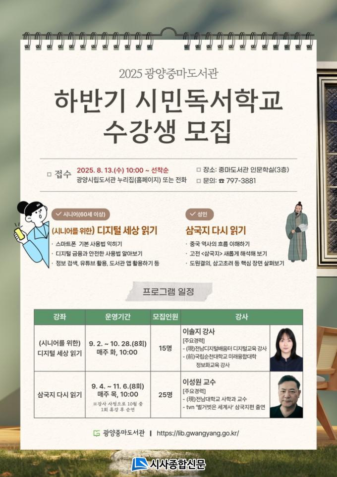 À̹ø °ÀÇ´Â ±¤¾ç½Ã ½Ã´Ï¾î ºÏ½ºÅ¸Æ® »ç¾÷ÀÇ ÀÏȯÀ¸·Î ¿î¿µµÈ ¡®½Ã´Ï¾î¸¦ À§ÇÑ ÀÏ»ó ¼Ó µðÁöÅРȰ¿ë ±³À°¡¯ÀÇ ¼º°ú¿Í ¼ö¿ä¸¦ ¹Ý¿µÇØ ±âÁ¸ 3ȸÂ÷¿¡¼ 8ȸÂ÷·Î È®´ëµÆ´Ù. ´ë»óÀº 60¼¼ ÀÌ»ó ±¤¾ç½Ã¹ÎÀ̸ç, 9¿ù 2ÀϺÎÅÍ 10¿ù 28ÀϱîÁö ¸ÅÁÖ È¿äÀÏ ¿ÀÀü 10½Ã¿¡ ¿¸°´Ù.