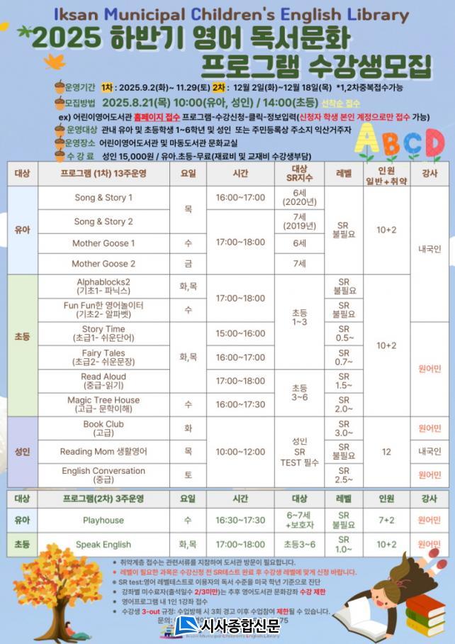 ÀÍ»ê½Ã´Â ÀÍ»ê½Ã¸³¾î¸°ÀÌ¿µ¾îµµ¼°ü(ICEL)¿¡¼ ¿À´Â 9¿ùºÎÅÍ 12¿ù±îÁö ÇϹݱ⠿µ¾îµ¶¼¹®È°Á¸¦ ¿î¿µÇÑ´Ù°í 18ÀÏ ¹àÇû´Ù.