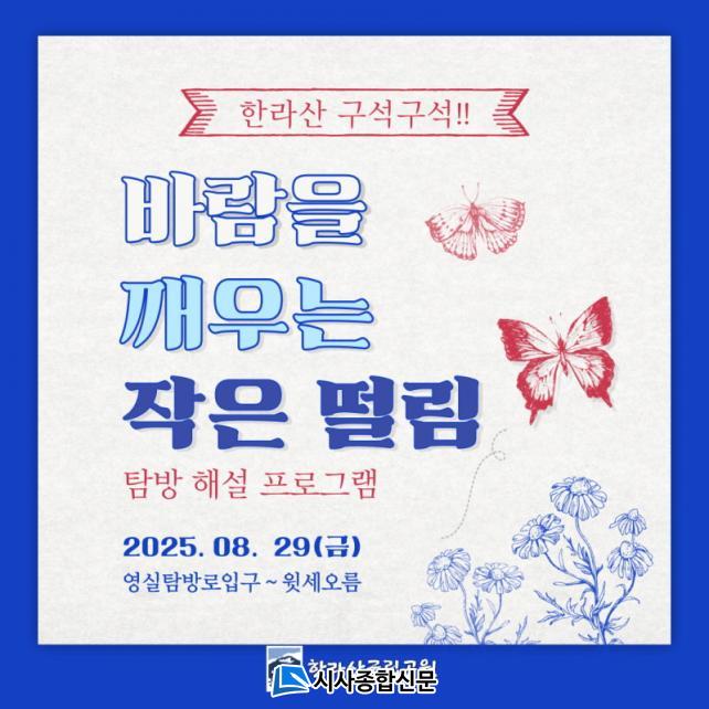 ³× ¹øÂ° À̾߱⠡®¹Ù¶÷À» ±ú¿ì´Â ÀÛÀº ¶³¸²¡¯Àº ¿µ½Ç޹æ·Î ÀÔ±¸¿¡¼ À¼¼¿À¸§±îÁö 3.7km ±¸°£À» °ÉÀ¸¸ç, °íÁö´ë¿¡ ¼½ÄÇÏ´Â ³ªºñ¸¦ ã¾Æ °üÂûÇϴ Ž¹æ ÇÁ·Î±×·¥ÀÌ´Ù. Âü°¡ÀÚ´Â ÀÚ¿¬È¯°æÇؼ³»çÀÇ ¾È³»¿Í ÇØ¼³À» ÅëÇØ ÇѶó»êÀÇ ´Ù¾çÇÑ »ýÅÂ¿Í ¸Å·ÂÀ» ±íÀÌ Ã¼ÇèÇÒ ¼ö ÀÖ´Ù.