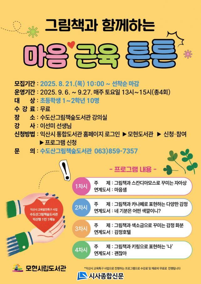 À̹ø ÇÁ·Î±×·¥Àº ÃʵîÇб³ 1~2ÇгâÀ» ´ë»óÀ¸·Î ÃÑ 4ȸ ÁøÇàµÇ¸ç, ±³À°¹ßÀüƯ±¸ »ç¾÷ 'ÀÍ»êÇü 1ÀÎ 1Àç´É'ÀÇ ÀÏȯÀ¸·Î ¸¶·ÃµÆ´Ù. ¼öµµ»ê±×¸²Ã¥½£µµ¼°üÀº Áö³ 6¿ùºÎÅÍ 1ÀÎ 1Àç´É »ç¾÷À¸·Î Ãʵî 3~6Çг⠴ë»ó '¾î¸°ÀÌ ±×¸²Ã¥ ÀÛ°¡ ¾ç¼º'µµ ¿î¿µÇϰí ÀÖ´Ù.