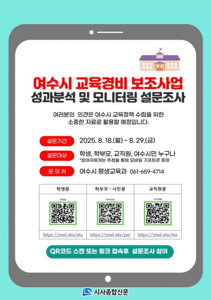 [½Ã»çÁ¾ÇսŹ® = ¿À½ÂÅà ±âÀÚ] ¿©¼ö½Ã(½ÃÀå Á¤±â¸í)´Â ±³À°°æºñ º¸Á¶»ç¾÷¿¡ ´ëÇÑ ½Ã¹Î °ü½É Á¦°í¿Í ¼ö¿äÀÚ ¸ÂÃã Áö¿øÀ» À§ÇØ 8¿ù 18ÀϺÎÅÍ 29ÀϱîÁö ¡®±³À°°æºñ º¸Á¶»ç¾÷ ¼º°úºÐ¼® ¹× ¸ð´ÏÅ͸µ ¼³¹®Á¶»ç¡¯¸¦ ¿Â¶óÀÎÀ¸·Î ½Ç½ÃÇÑ´Ù.