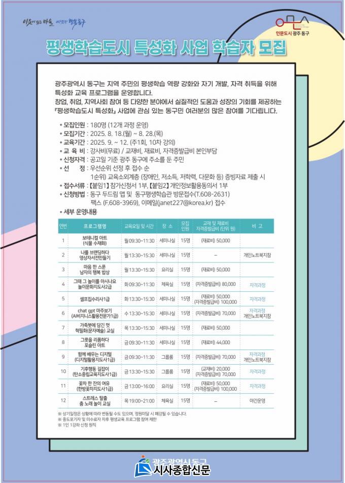 ±³À°Àº 9¿ùºÎÅÍ 11¿ù±îÁö ÁøÇàµÇ¸ç, °»çºñ´Â ¹«·áÀ̳ª ±³Àçºñ¿Í Àç·áºñ, ÀÚ°ÝÁõ ¹ß±Þºñ´Â º»ÀÎ ºÎ´ãÀÌ´Ù. µ¿±¸¿¡ °ÅÁÖÇÏ´Â ÁÖ¹ÎÀÌ¸é ´©±¸³ª ½Åû °¡´ÉÇϸç, Àå¾ÖÀÎ, Àú¼ÒµæÃþ, ´Ù¹®È°¡Á· µî ±³À° ¼Ò¿Ü°èÃþÀº ¿ì¼± ¼±¹ßµÈ´Ù. Âü¿©¸¦ ¿øÇÏ´Â ±¸¹ÎÀº ¿À´Â 28ÀϱîÁö µ¿±¸ µÎµå¸² ¾ÛÀ» ÅëÇØ ¿Â¶óÀÎ ½ÅûÇϰųª µ¿±¸Æò»ýÇнÀ°üÀ» ¹æ¹®ÇØ Á¢¼öÇÏ¸é µÈ´Ù.