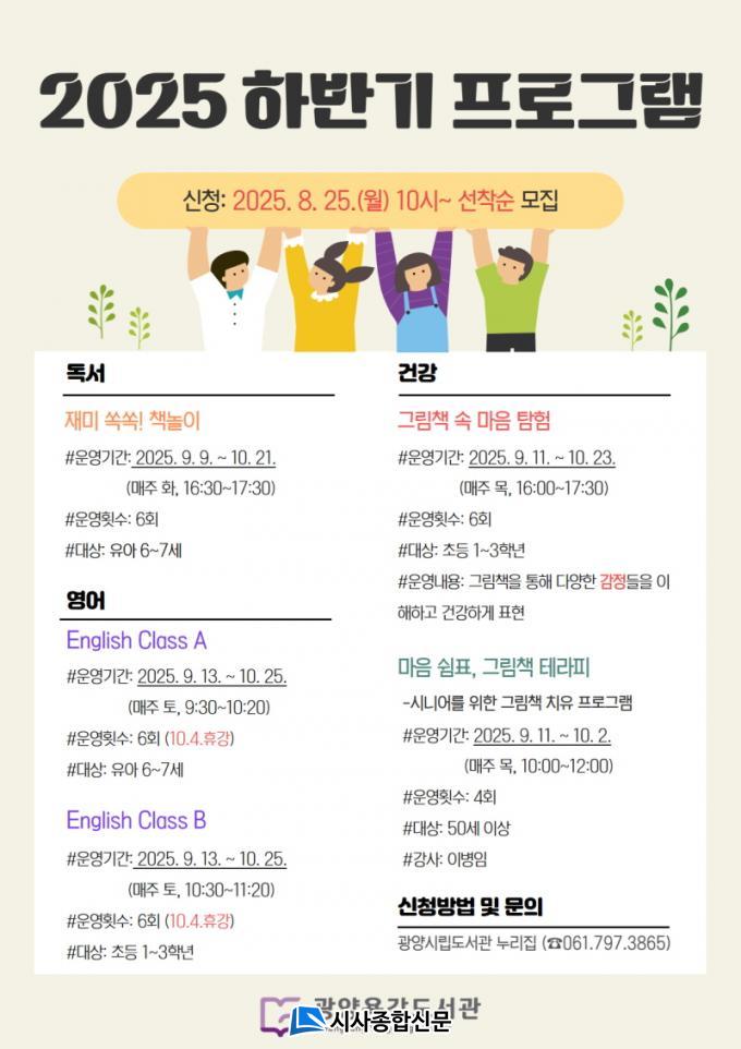 À̹ø ÇϹݱâ ÇÁ·Î±×·¥Àº ¡ã±×¸²Ã¥ ¼Ó ¸¶À½ ŽÇè ¡ã¸¶À½ ½°Ç¥, ±×¸²Ã¥ Å×¶óÇÇ ¡ãÀç¹Ì ½ï½ï! Ã¥³îÀÌ ¡ãEnglish Class A(6~7¼¼) ¡ãEnglish Class B(Ãʵî 1~3Çгâ) ÃÑ 5°³ °Á·Î, ¿À´Â 9¿ù 9ÀϺÎÅÍ 10¿ù 25ÀϱîÁö ¿î¿µµÈ´Ù.