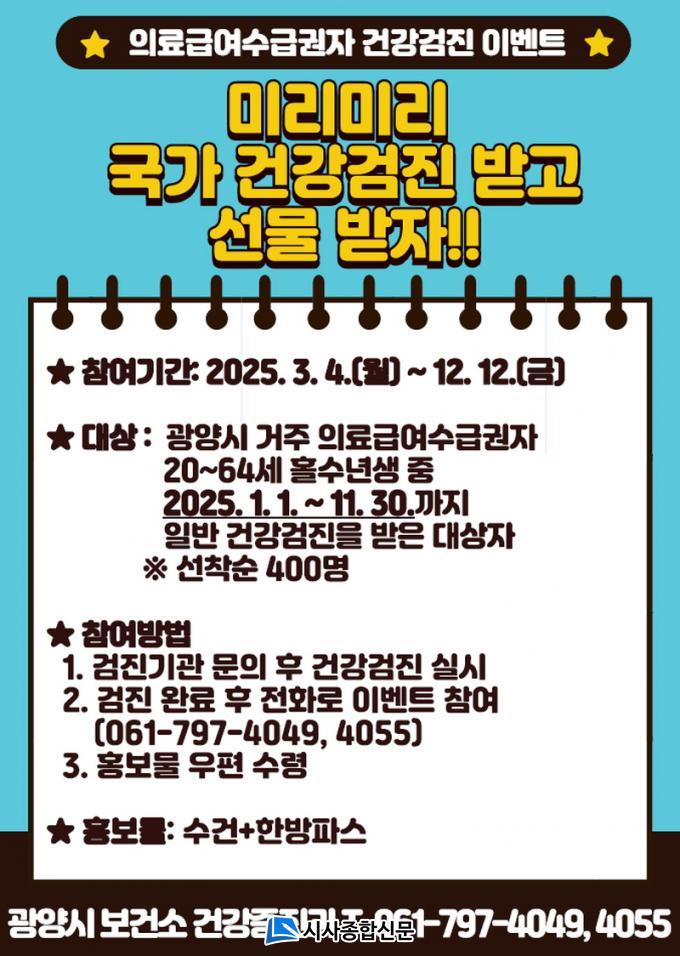 ÇÑÆí, ±¤¾ç½Ã´Â ÀÇ·á±Þ¿©¼ö±Þ±ÇÀÚÀÇ °Ç°°ËÁø Âü¿©À² Á¦°í¸¦ À§ÇØ ¿À´Â 11¿ù±îÁö ¼ö°Ç°ú ÇÑ¹æ ÆÄ½º¸¦ Á¦°øÇÏ´Â ¡®20~64¼¼ ÀÇ·á±Þ¿©¼ö±Þ±ÇÀÚ ´ë»ó °Ç°°ËÁø Âü¿© À̺¥Æ®¡¯¸¦ ¿î¿µÇÒ °èȹÀÌ´Ù.