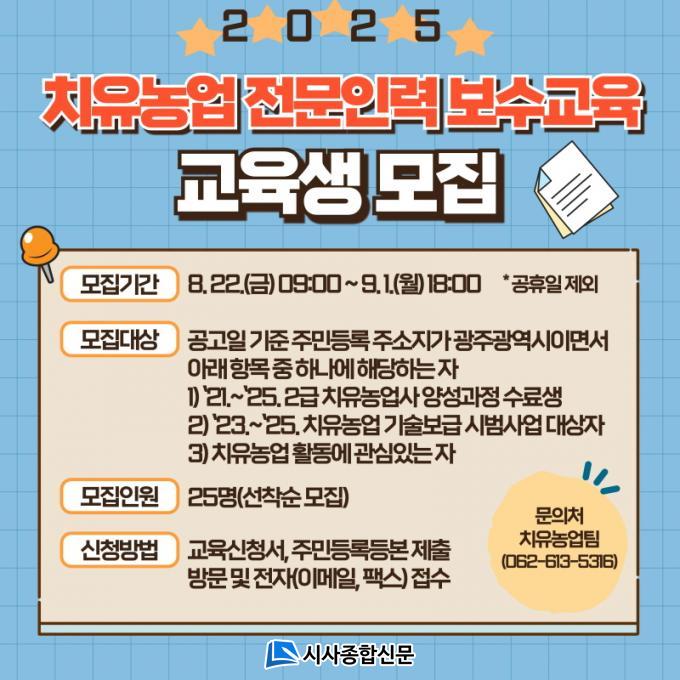 [½Ã»çÁ¾ÇսŹ® = ¿À½ÂÅà ±âÀÚ] ±¤ÁÖ±¤¿ª½Ã ³ó¾÷±â¼ú¼¾ÅÍ´Â Ä¡À¯³ó¾÷ Àü¹®ÀηÂÀÇ ÇöÀå ¼öÇà´É·ÂÀ» °ÈÇϱâ À§ÇØ ¡®Ä¡À¯³ó¾÷ Àü¹®Àη º¸¼ö±³À°¡¯¿¡ Âü°¡ÇÒ ±³À°»ý 25¸íÀ» ¿À´Â 9¿ù1ÀϱîÁö ¸ðÁýÇÑ´Ù.