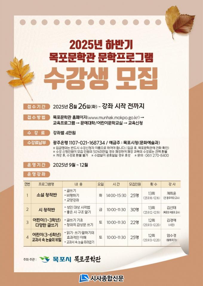 ¼ö° ½ÅûÀº 8¿ù 26ÀϺÎÅÍ °Á ½ÃÀÛ Àü±îÁö ¸ñÆ÷¹®Çаü ȨÆäÀÌÁö¿¡¼ ¼±Âø¼ø Á¢¼ö °¡´ÉÇϸç, ¼ö°·á´Â °Áº° 4¸¸ ¿øÀÌ´Ù. ÀÚ¼¼ÇÑ ³»¿ëÀº ¸ñÆ÷¹®Çаü ȨÆäÀÌÁö¿¡¼ È®ÀÎÇÒ ¼ö ÀÖ´Ù.
