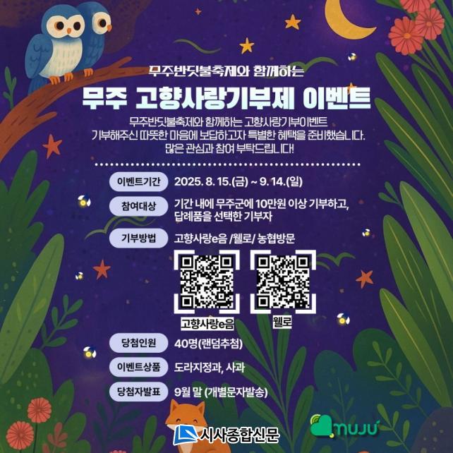 À̹ø Çà»ç´Â °ÇÀüÇÑ ±âºÎ¹®È È®»ê°ú ±âºÎÀڵ鿡°Ô °¨»çÀÇ ¸¶À½À» ÀüÇÑ´Ù´Â ÃëÁö¿¡¼ ÁøÇàµÇ´Â °ÍÀ¸·Î, ±â°£ ³»(8. 15.~9. 14.) ¹«ÁÖ¿¡ 10¸¸ ¿ø ÀÌ»ó ±âºÎÇÏ°í ´ä·ÊǰÀ» ¼±ÅÃÇÑ ±âºÎÀÚ Áß Ãß÷À» ÅëÇØ 40¸í(°³º° Å뺸)À» ¼±Á¤ÇÑ´Ù.