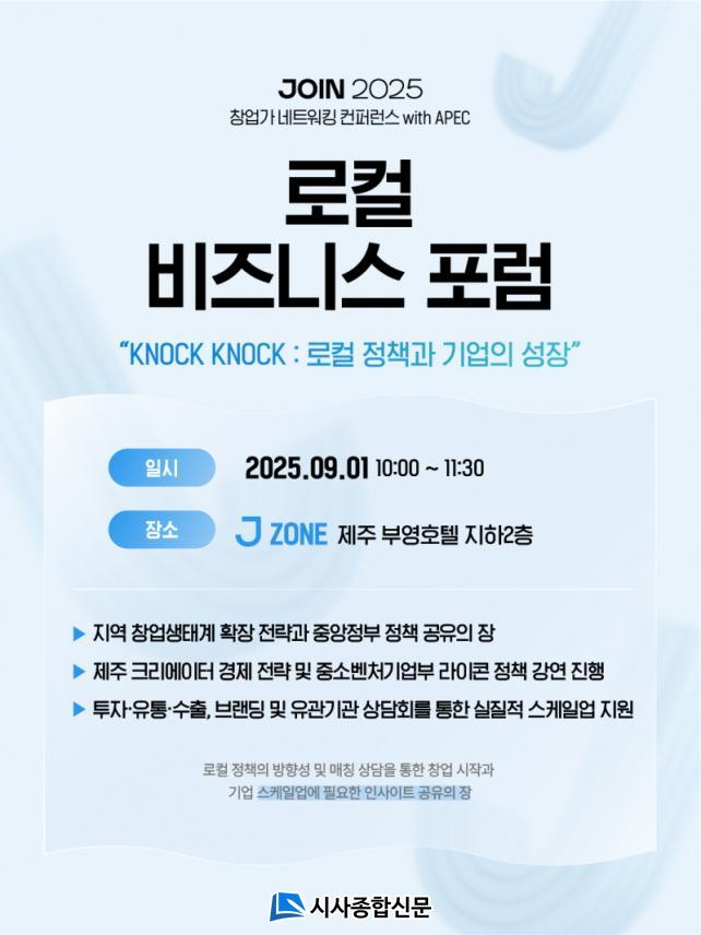 JOIN 2025ÀÇ ½ÃÀÛÀ» ¾Ë¸®´Â À§ µÎ Æ÷·³Àº 9¿ù 1ÀÏ ¿ù¿äÀÏ ¿ÀÀü 10½ÃºÎÅÍ 11½Ã 30ºÐ±îÁö Á¦ÁÖ ºÎ¿µÈ£ÅÚ ÁöÇÏ 2Ãþ¿¡¼ ÁøÇàµÈ´Ù. â¾÷»ýÅÂ°è ³×Æ®¿öÅ© Æ÷·³Àº O ZONE , ·ÎÄà ºñÁî´Ï½º Æ÷·³Àº J ZONE¿¡¼ ÁøÇàµÈ´Ù.
