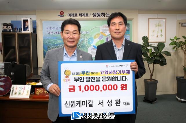 [½Ã»çÁ¾ÇսŹ® = ¿À½ÂÅà ±âÀÚ] ºÎ¾È±ºÀº Áö³´Þ 28ÀÏ ÀüÁֽà ¼ÒÀç ÈÇÐÁ¦Ç° À¯Åë±â¾÷ ½Å¿øÄɹÌÄ®ÀÇ ¼¼ºÈ¯ ´ëÇ¥°¡ °íÇâ»ç¶û±âºÎ±Ý 100¸¸ ¿øÀ» ±âŹÇß´Ù°í ¹àÇû´Ù.