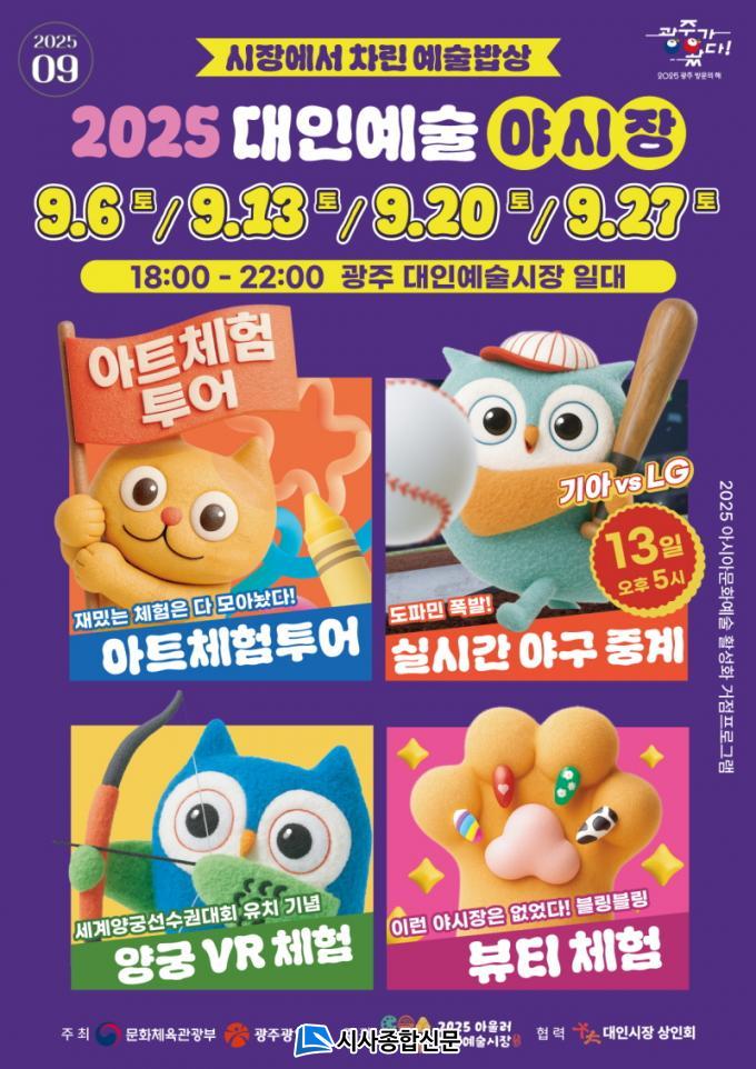 ±¤ÁÖ±¤¿ª½Ã(½ÃÀå °±âÁ¤)´Â 9¿ù6ÀϺÎÅÍ 11¿ù22ÀϱîÁö(Ãß¼®¿¬ÈÞ 10¿ù 4Àϰú 11ÀÏ Á¦¿Ü) ¡®2025³â ÇϹݱ⠴ëÀο¹¼ú¾ß½ÃÀ塯À» ÃÑ 10ȸ ¿î¿µÇÑ´Ù. ¸ÅÁÖ Åä¿äÀÏ ¿ÀÈÄ 6½ÃºÎÅÍ 10½Ã±îÁö ÁøÇàµÈ´Ù.