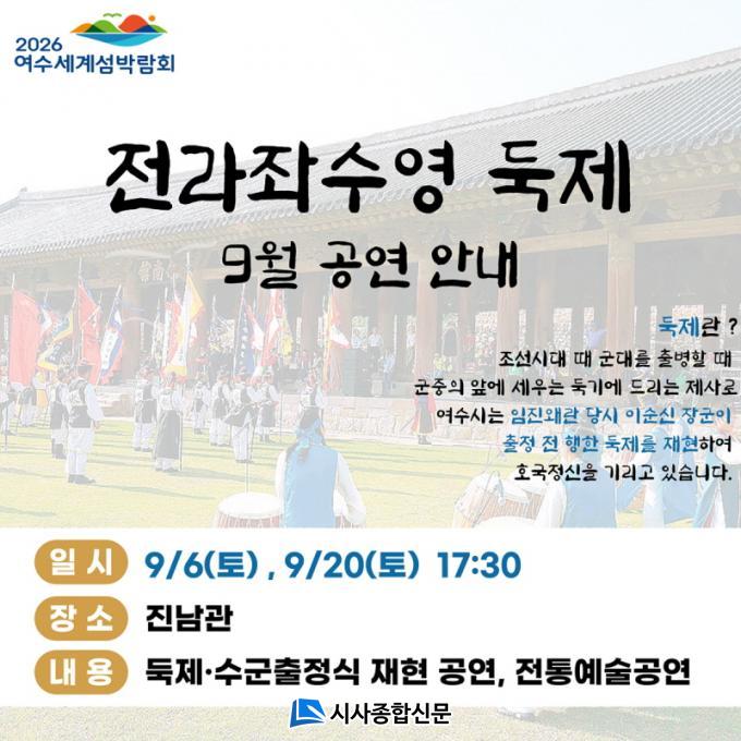 ¡®Àü¶óÁ¼ö¿µ µÏÁ¦¡¯´Â ÀÓÁø¿Ö¶õ ´ç½Ã À̼ø½Å À屺ÀÌ ¹é¼ºÀÇ Æò¾ÈÀ» ±â¿øÇÏ¸ç ¿Ã¸° Á¦·Ê¸¦ ¹ÙÅÁÀ¸·Î Àü¶óÁ¼ö¿µ°ú ¿©¼öÀÇ ¿ª»ç¸¦ ´ã¾Æ Çö´ëÀûÀ¸·Î ÀçÇØ¼®ÇÑ ¹®È¿¹¼ú °ø¿¬ÀÌ´Ù.