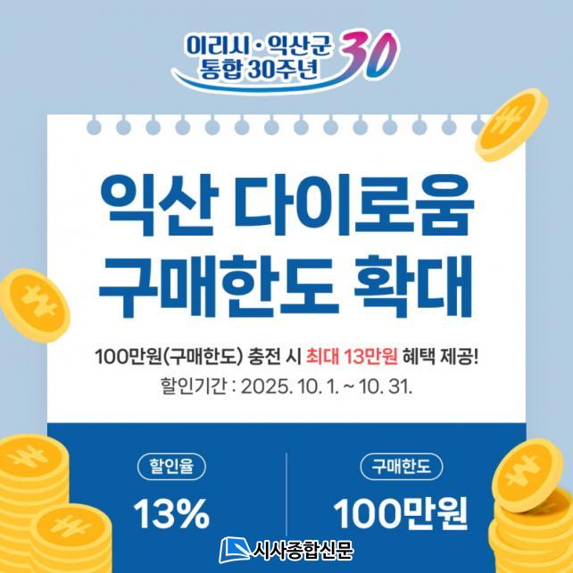 Á¤ÇåÀ² ÀÍ»ê½ÃÀåÀº "À̸®¡¤ÀÍ»ê ÅëÇÕ 30ÁÖ³âÀ» ½Ã¹Î°ú ÇÔ²² ÃàÇÏÇϰíÀÚ '´ÙÀ̷οò Çѵµ È®´ë'¶ó´Â Ưº°ÇÑ ¼±¹°À» ¸¶·ÃÇß´Ù"¸ç "10¿ù ÇÑ ´Þ°£ ÀÍ»ê Àü¿ªÀÌ ÇϳªÀÇ Å« ÃàÁ¦ÀåÀÌ µÅ ½Ã¹Î°ú ¼Ò»ó°øÀÎ ¸ðµÎ°¡ ¿ôÀ» ¼ö ÀÖ´Â °è±â°¡ µÇ±æ ¹Ù¶õ´Ù"°í ¸»Çß´Ù.
