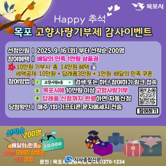 À̹ø À̺¥Æ®´Â ¸ñÆ÷ °íÇâ»ç¶û±âºÎÁ¦¿¡ Âü¿©ÇÑ ±âºÎÀÚ¸¦ ´ë»óÀ¸·Î Çϸç, º°µµÀÇ ½Åû ¾øÀÌ 10¸¸ ¿ø ÀÌ»ó ±âºÎ ÈÄ ´ä·Êǰ±îÁö ½ÅûÇϸé ÀÚµ¿ ÀÀ¸ðµÈ´Ù. ¼±Âø¼ø 200¸í¿¡°Ô´Â ¹è´ÞÀǹÎÁ· 1¸¸ ¿ø ¸ð¹ÙÀÏ »óǰ±ÇÀÌ Á¦°øµÈ´Ù.