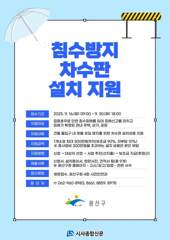 Â÷¼öÆÇ(¹°¸·ÀÌÆÇ) ¼³Ä¡ Áö¿ø»ç¾÷Àº °Ç¹° ÃâÀÔ±¸ ³» ºø¹° À¯ÀÔ Â÷´ÜÀ» À§ÇØ ±¤»ê±¸°¡ Â÷¼öÆÇ(¹°¸·ÀÌÆÇ) ¼³Ä¡ ºñ¿ëÀ» Áö¿øÇÏ´Â »ç¾÷ÀÌ´Ù. Â÷¼öÆÇ(¹°¸·ÀÌÆÇ) Áö¿ø ´ë»óÀº ÁýÁßÈ£¿ì·Î ÀÎÇÑ Ä§¼ö ÇÇÇØ¸¦ ÀÔÀº ÁÖÅ᤻󰡡¤°øÀåÀÌ´Ù.