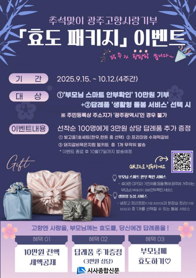 ±¤ÁÖ±¤¿ª½Ã(½ÃÀå °±âÁ¤)´Â ¿À´Â 10¿ù12ÀϱîÁö °íÇâ»ç¶û±âºÎÁ¦ Âü¿©¸¦ µ¶·ÁÇÏ°í ºÎ¸ð´Ô µ¹º½¼ºñ½º ÀÌ¿ëÀ» Àå·ÁÇϱâ À§ÇØ ¡®Ãß¼®¸ÂÀÌ È¿µµÆÐŰÁö À̺¥Æ®¡¯¸¦ ÁøÇàÇÑ´Ù.