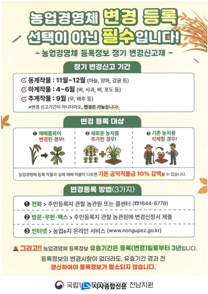 ¿µ±¤³ó°ü¿ø ±è±Ù¿ì »ç¹«¼ÒÀåÀº ¡°°æ¿µÃ¼ µî·ÏÁ¤º¸ÀÇ Á¤È®µµ¸¦ ³ôÀÌ·Á¸é ³ó¾÷ÀÎÀÇ Àû±ØÀûÀÎ Âü¿©°¡ ÇʼöÀû¡±À̶ó°í °Á¶Çϸç, ¡°Àç¹èǰ¸ñÀ̳ª ³óÁö°¡ º¯°æµÇ¸é À̹ø Á¤±â º¯°æ ½Å°í±â°£¿¡ ²À ½Å°íÇØ ´Þ¶ó¡±°í ´çºÎÇÏ¿´´Ù.