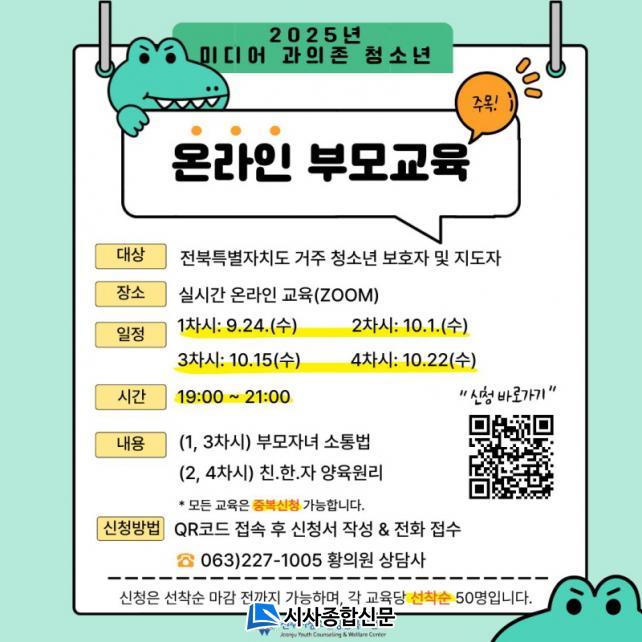 °¢ ±³À°Àº ¼±Âø¼ø 50¸í±îÁö ½Åû °¡´ÉÇϸç, Âü¿©¸¦ ¿øÇÏ´Â ½Ã¹ÎÀº Æ÷½ºÅÍ QRÄڵ带 Ȱ¿ëÇϰųª ÀüÈ(063-227-1005)·Î Á¢¼öÇÏ¸é µÈ´Ù. ±âŸ ÀÚ¼¼ÇÑ »çÇ×Àº ¼¾ÅÍ ´©¸®Áý(www.jjsangdam.or.kr)¿¡¼ È®ÀÎÇÒ ¼ö ÀÖ´Ù.