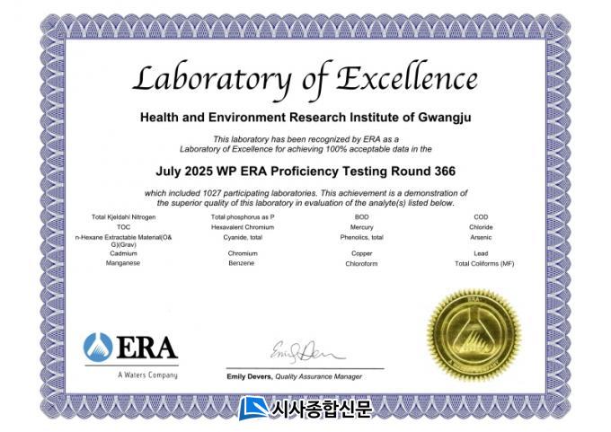 [½Ã»çÁ¾ÇսŹ® = ¿À½ÂÅà ±âÀÚ] ±¤ÁÖ±¤¿ª½Ã º¸°Çȯ°æ¿¬±¸¿øÀÌ ÃÖ±Ù ¹Ì±¹ ȯ°æÀÚ¿øÇùȸ(ERA)°¡ ÁÖ°üÇÑ ¼öÁúºÐ¾ß ±¹Á¦ ¼÷·Ãµµ½ÃÇè¿¡¼ Àü Ç׸ñ ¡®¸¸Á·(Satisfactory)¡¯ ÆÇÁ¤À» ¹Þ¾Æ ¡®2025 ÃÖ¿ì¼ö ºÐ¼®±â°ü(Laboratory of Excellence)¡¯À¸·Î ¼±Á¤µÆ´Ù.