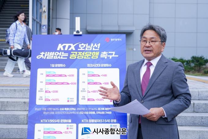 °±âÁ¤ ±¤ÁÖ½ÃÀåÀº ¡°È£³²¼± KTX ÁõÆíÀº ´õ ÀÌ»ó ¹Ì·ê ¼ö ¾ø´Â ¹Î»ý°úÁ¦À̸ç, ºÒ°øÁ¤ ¿îÇà ÇØ¼Ò´Â ±¹¹Î À̵¿±Ç º¸ÀåÀÇ ÇÙ½ÉÀÌ´Ù¡±¸ç ¡°Á¤ºÎ°¡ È£³²¹ÎµéÀÇ Àý½ÇÇÑ ¿ä±¸¿¡ ½ÇÇà°¡´ÉÇÑ Á¤Ã¥À¸·Î ÀÀ´äÇØ¾ß ÇÑ´Ù¡±°í KTX Â÷º° ÇØ¼Ò¸¦ Ã˱¸Çß´Ù. .