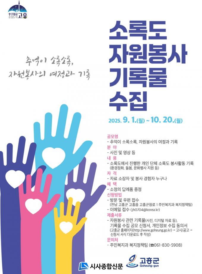 ÇÑÆí, ¼Ò·Ïµµ ÀÚ¿øºÀ»ç ±â·Ï¹° ¼öÁý °ø¸ð Âü¿©´Â °íÈﱺ ´ëÇ¥ ´©¸®Áý¿¡¼ ½Åû¼¸¦ ³»·Á¹Þ¾Æ ÀÛ¼ºÇÑ ÈÄ À̸ÞÀÏÀ̳ª ¿ìÆíÀ¸·Î ½Åû¼¸¦ Á¦ÃâÇÏ¸é µÈ´Ù. ÀÚ¼¼ÇÑ ³»¿ëÀº Áֹκ¹Áö°ú(061-830-5908)¸¦ ÅëÇØ ¾È³»¹ÞÀ» ¼ö ÀÖ´Ù.
