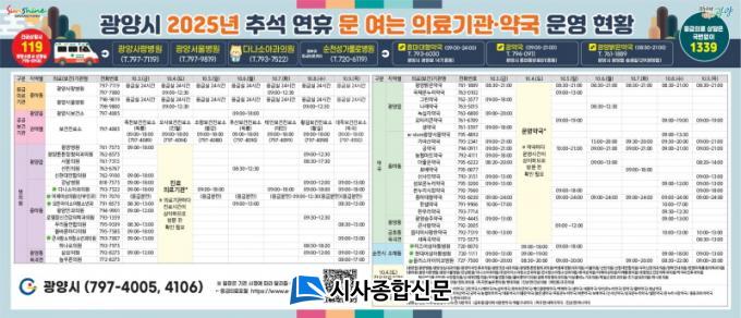 Ãß¼® ¿¬ÈÞ ¹® ¿©´Â ÀÇ·á±â°ü°ú ¾à±¹ ÇöȲÀº ¡ã±¤¾ç½Ã ¸ð¹ÙÀÏ ¾Û ¡®MY±¤¾ç¡¯ ¡ã½Ã ´©¸®Áý(ȨÆäÀÌÁö) ¡ã±¤¾ç½Ã ºí·Î±× µî SNS ¡ã129 º¸°Çº¹ÁöÄݼ¾Å͸¦ ÅëÇØ È®ÀÎÇÒ ¼ö ÀÖ´Ù. ½º¸¶Æ®Æù ¾ÖÇø®ÄÉÀÌ¼Ç ¡®ÀÀ±ÞÀÇ·áÁ¤º¸Á¦°ø¡¯ ¿¡¼µµ ³» ÁÖº¯ º´ÀÇ¿ø, ¾à±¹ Á¤º¸¿Í »óȲº° ÀÀ±Þóġ ¿ä·É µî ´Ù¾çÇÑ ÀÇ·áÁ¤º¸¸¦ È®ÀÎ °¡´ÉÇÏ´Ù.