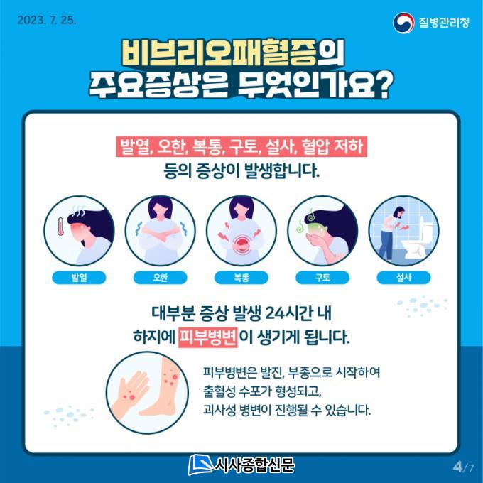 ºñºê¸®¿ÀÆÐÇ÷ÁõÀº ÇØ¼ö ¿Âµµ°¡ ³ô¾ÆÁö´Â 8~10¿ù¿¡ ÁýÁßÀûÀ¸·Î ¹ß»ýÇϸç, ÁÖµÈ °¨¿° ¿øÀÎÀº ±Õ¿¡ ¿À¿°µÈ ¾îÆÐ·ù ¼·Ãë¿Í »óó ºÎÀ§ÀÇ ¹Ù´å¹° Á¢ÃËÀÌ´Ù. °¨¿° ½Ã 12~72½Ã°£ÀÇ Àẹ±â¸¦ °ÅÃÄ ±Þ¼º ¹ß¿¡¤¿ÀÇÑ¡¤º¹Å롤±¸Åä Áõ»óÀÌ ³ªÅ¸³ª°í, ¹ßº´ ÈÄ 24½Ã°£ ³» ¹ßÁø¡¤ºÎÁ¾¡¤¼öÆ÷ µî ÇǺκ´º¯ÀÌ ¹ß»ýÇÑ´Ù.