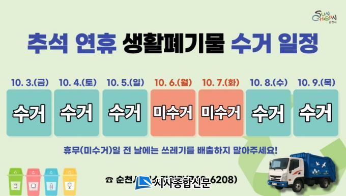 Ãß¼® ¿¬ÈÞ ±â°£ µ¿¾È Á¾·®Á¦ ¹× ÀçȰ¿ë, À½½Ä¹°¾²·¹±â µî »ýȰÆó±â¹° ¼ö°Å´Â 10¿ù 3ÀÏ ±Ý¿äÀϺÎÅÍ 10¿ù 5ÀÏ ÀÏ¿äÀϱîÁö Á¤»óÀûÀ¸·Î ÀÌ·ïÁö¸ç, Ãß¼® ´çÀÏÀÎ 10¿ù 6ÀÏ ¿ù¿äÀϰú 10¿ù 7ÀÏ È¿äÀϱîÁö ÀÌÆ²°£Àº ¼ö°ÅÇÏÁö ¾Ê´Â´Ù. 10¿ù 8ÀÏ ¼ö¿äÀϺÎÅÍ´Â Æò»ó½Ã¿Í °°ÀÌ Á¤»ó ¼ö°ÅÇÑ´Ù.
