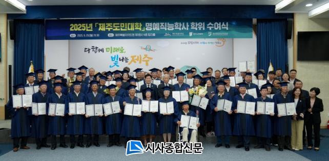 Á¦ÁÖÆ¯º°ÀÚÄ¡µµ´Â 29ÀÏ µµÃ» ޶óȦ¿¡¼ ¡¸2025³â Á¦ÁÖµµ¹Î´ëÇÐ ¸í¿¹Á÷´ÉÇÐÀ§¡¹ ¼ö¿©½ÄÀ» °³ÃÖÇß´Ù. ¼ö¿©½Ä¿¡´Â ¿À¿µÈÆ Á¦ÁÖµµÁö»ç¿Í ÇÐÀ§ ¼ö¿©ÀÚ, °¡Á·, ³ó¡¤¾î¾÷¡¤Ãà»ê ´Üü °ü°èÀÚ µî 200¿© ¸íÀÌ Âü¼®ÇØ Æò»ýÀ» 1Â÷»ê¾÷¿¡ ¹ÙÄ£ µµ¹ÎµéÀÇ °ø·Î¸¦ ±â·È´Ù.