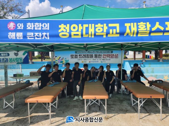 ÀçȰ½ºÆ÷Ã÷°ú¿¡¼´Â ±è¼ºÅà ÇаúÀåÀ» ºñ·ÔÇØ ÀÌÁ¤·¡¡¤¼Û°ü¹® ±³¼ö¿Í ÀçÇлý 12¸íÀÌ Âü¿©ÇØ ½ºÆ÷Ã÷¸¶»çÁö¿Í ½ºÆ÷Ã÷ Å×ÀÌÇÎ ºÀ»çȰµ¿À» ½Ç½ÃÇß´Ù. ÇлýµéÀº Çà»ç¿¡ Âü¿©ÇÑ ¾î¸£½ÅµéÀÇ ÇǷΠȸº¹°ú °Ç° ÁõÁøÀ» À§ÇØ ´Ù¾çÇÑ Àü¹® ¼ºñ½º¸¦ Á¦°øÇßÀ¸¸ç, À̸¦ ÅëÇØ Àü°ø ½Ç¹« °æÇèÀ» ½×°í Áö¿ª»çȸ¿ÍÀÇ »ó»ý °¡Ä¡¸¦ ¸ö¼Ò ½ÇõÇß´Ù.