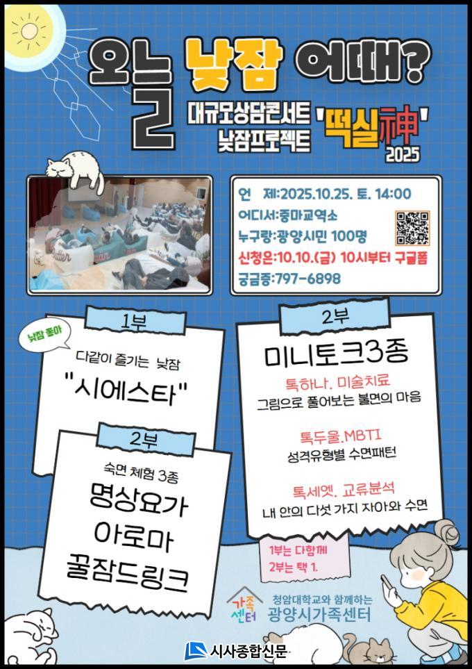 ¼¾ÅÍ´Â À̹ø ÇÁ·Î±×·¥À» ´Ü¼øÇÑ ³·ÀáÀÌ ¾Æ´Ñ, ¼ö¸éÀ» ÁÖÁ¦·Î ÇÑ »ó´ã°ú üÇèÀÌ °áÇÕµÈ ½É¸®¡¤Á¤¼ ȸº¹ ÇÁ·ÎÁ§Æ®·Î ÁøÇàÇÑ´Ù.