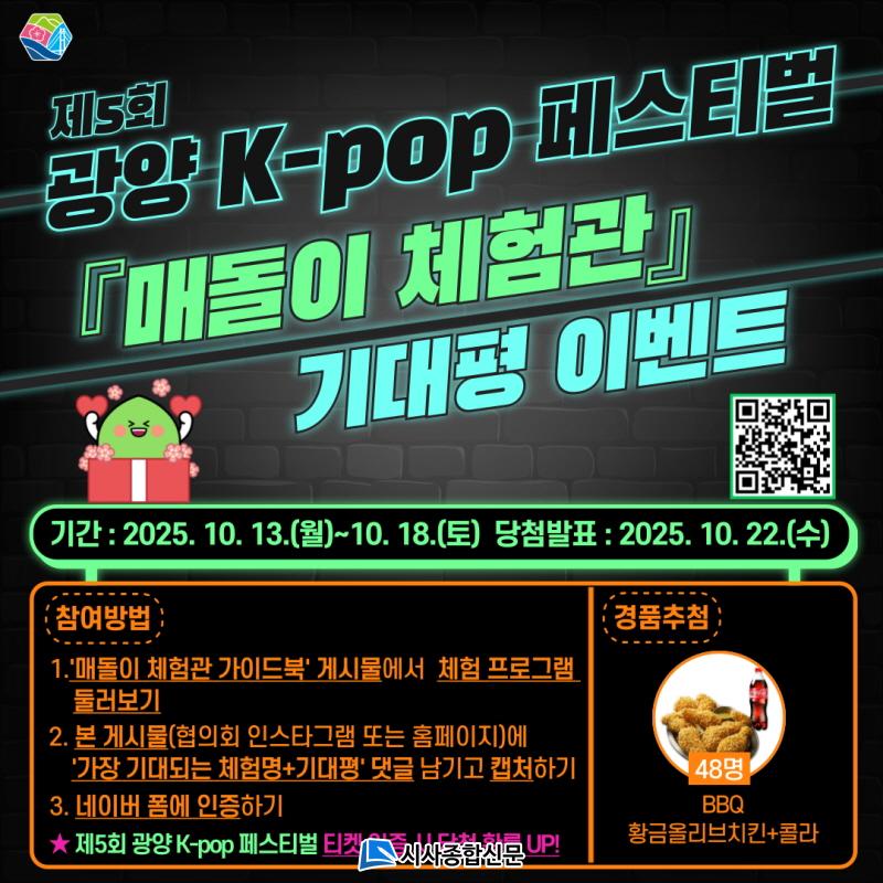 À̺¥Æ® Âü¿©¸¦ ¿øÇÒ °æ¿ì, ±¤¾ç½Ã°ü±¤ÇùÀÇȸ ÀνºÅ¸±×·¥ ¶Ç´Â ȨÆäÀÌÁö¿¡¼ ¡®¸Åµ¹ÀÌ Ã¼Çè°ü °¡À̵åºÏ¡¯ °Ô½Ã¹°À» È®ÀÎÇÑ µÚ, °¡Àå ±â´ëµÇ´Â üÇè¸í°ú ±â´ëÆòÀ» ´ñ±Û·Î ³²±â°í ³×À̹ö Æû¿¡ ÀÎÁõÇÏ¸é µÈ´Ù.À̺¥Æ® ±â°£Àº 10¿ù 13ÀϺÎÅÍ 18ÀϱîÁö¸ç, Ãß÷À» ÅëÇØ ÃÑ 48¸í¿¡°Ô BBQ Ȳ±Ý¿Ã¸®ºêġŲ°ú ÄÝ¶ó ¼¼Æ®¸¦ ÁõÁ¤ÇÑ´Ù. ´ç÷ÀÚ´Â 10¿ù 22ÀÏ ¹ßÇ¥ ¿¹Á¤ÀÌ´Ù.