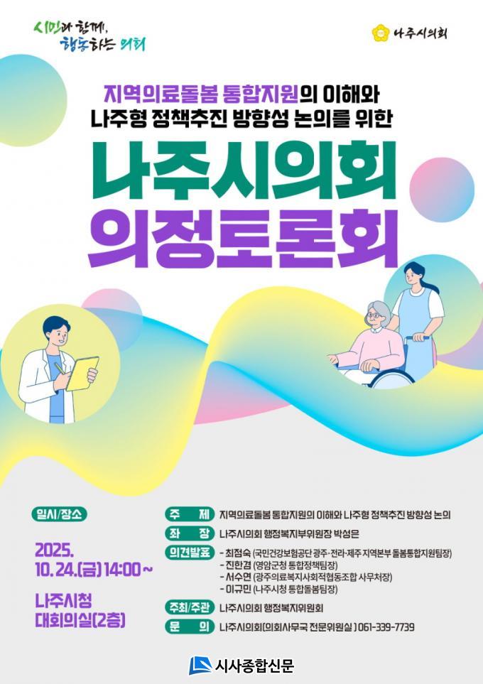 Åä·Ðȸ´Â ¹Ú¼ºÀº ³ªÁÖ½ÃÀÇȸ ÇàÁ¤º¹ÁöÀ§¿øÈ¸ ºÎÀ§¿øÀåÀÌ ÁÂÀåÀ» ¸Ã¾Æ ÁøÇàµÇ¸ç, ÃÖÁ¡¼÷ ±¹¹Î°Ç°º¸Çè°ø´Ü ±¤ÁÖ¡¤Àü¶ó¡¤Á¦ÁÖÁö¿ªº»ºÎ µ¹º½ÅëÇÕÁö¿øÆÀÀå, ÁøÇѰâ Àü¶ó³²µµ ¿µ¾Ï±ºÃ» ÅëÇÕÁ¤Ã¥ÆÀÀå, ¼¼ö¿¬ ±¤ÁÖÀǷẹÁö»çȸÀûÇùµ¿Á¶ÇÕ »ç¹«Ã³Àå, À̱ԹΠ³ªÁÖ½Ãû ÅëÇÕµ¹º½ ÆÀÀåÀÇ Àǰ߹ßÇ¥·Î ÁøÇàµÉ ¿¹Á¤ÀÌ´Ù.